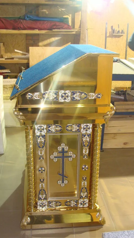 Церковний аналой золотистого кольору з декоративним камінням і вставками. Виготовлений на сучасному обладнанні з використанням матеріалів високої якості, які прослужать тривалий час і не втратять свій зовнішній вигляд.