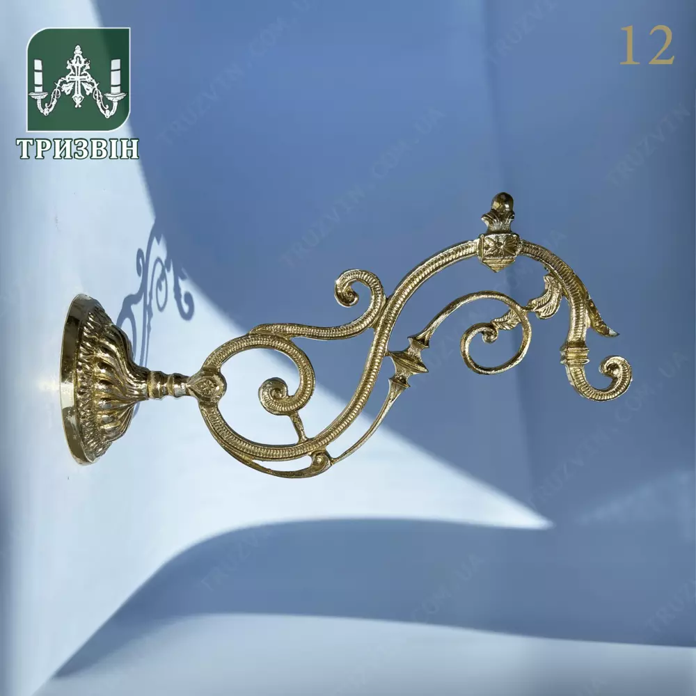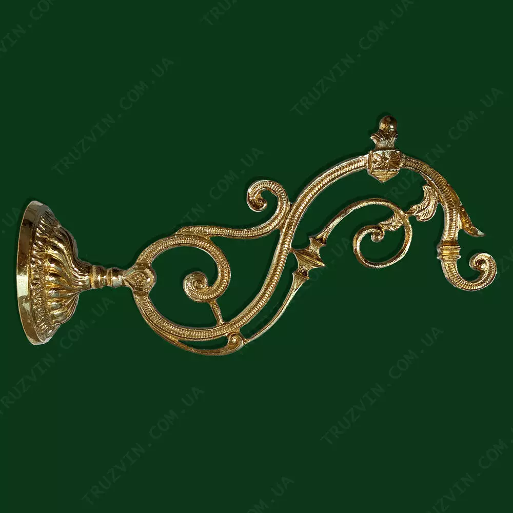 Великий кронштейн виготовлений з високоякісного сплаву латуні, яка характеризується прекрасною стійкістю до будь-яких негативних факторів зовнішнього середовища. Для ще кращої краси даний кронштейн покритий золотистою фарбою і різноманітними декоруючими елементами.