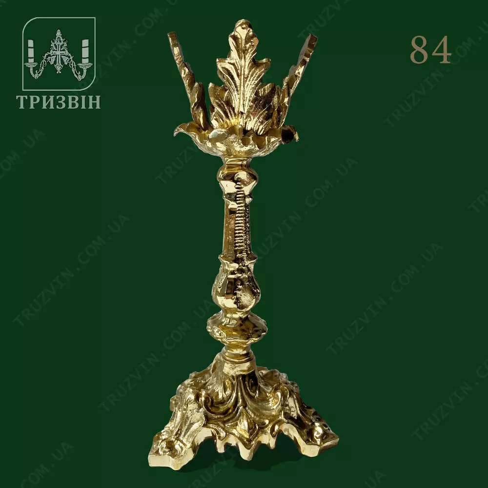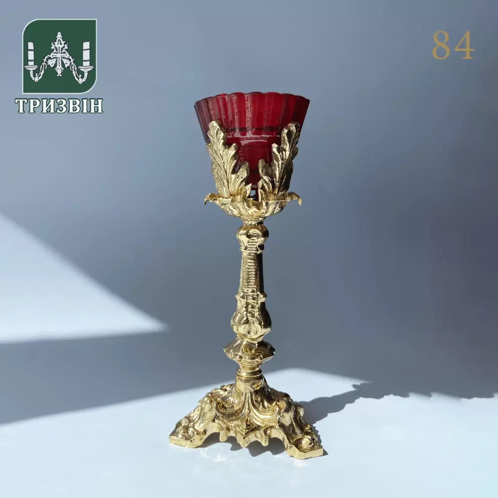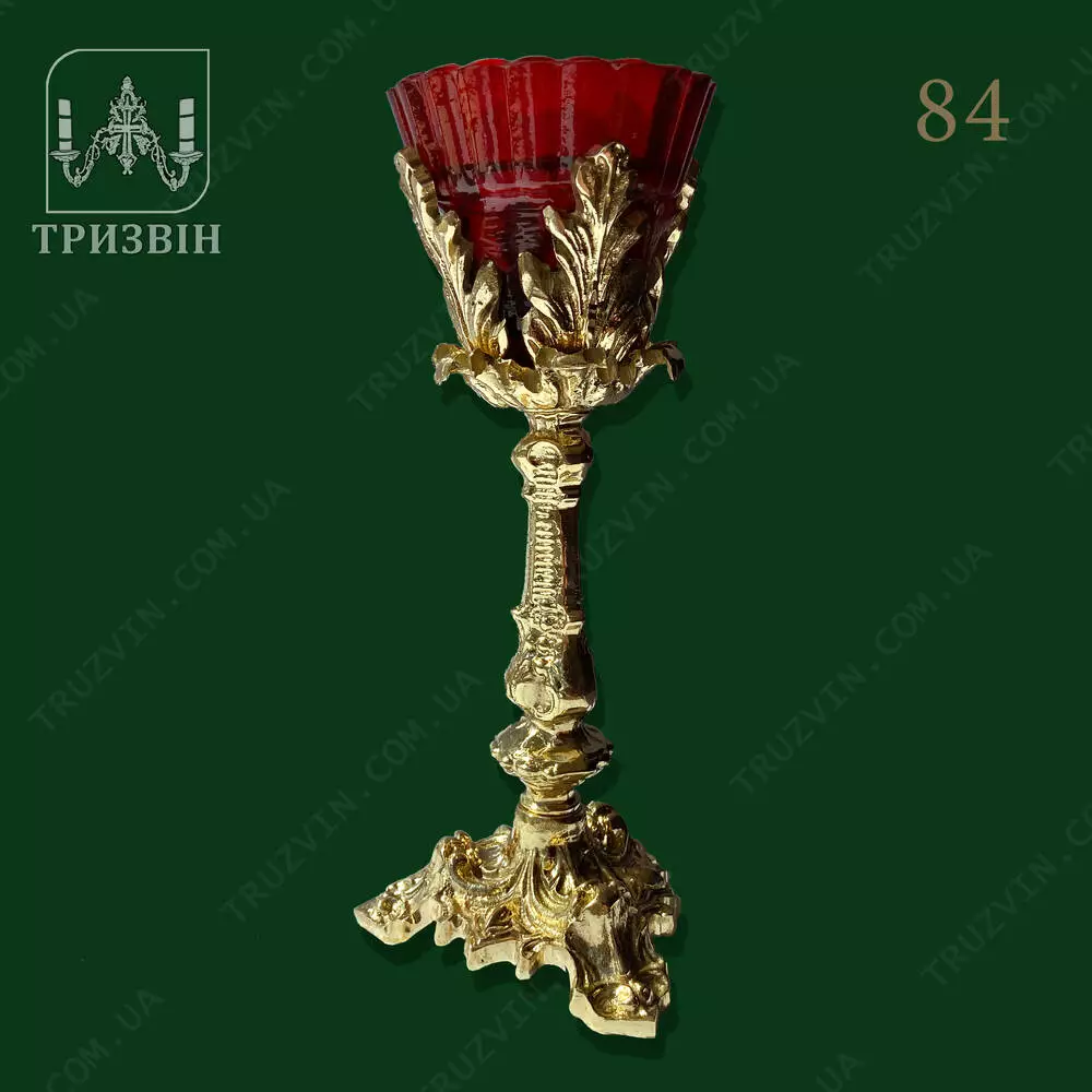 Церковна настільна лампадка золотистого кольору, прикрашена різноманітними декоруючими елементами. В якості основної сировини для її виготовлення було використано латунь. Цей матеріал ідеально підходить для подібних виробів, тому що надовго зберігає свій первозданний вигляд при будь-яких умовах.