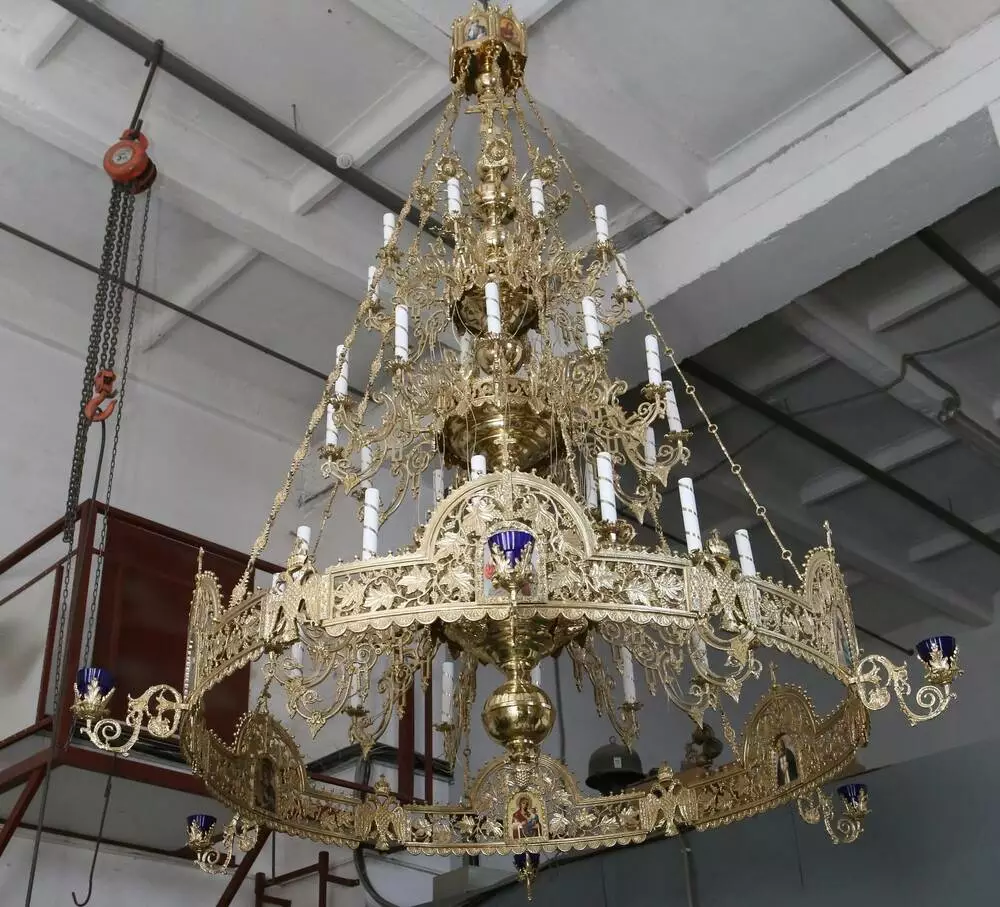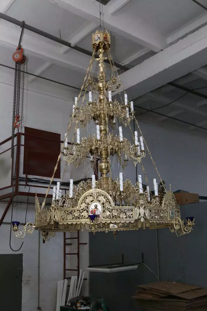 В нашому магазині можна купити готові моделі або замовити нестандартні церковні люстри за індивідуальними кресленнями. Габарити, кількість ярусів та свічок може бути різною. Панікадила виготовляємо з якісної латуні, оздоблення - напилення нітрит титану (булат).