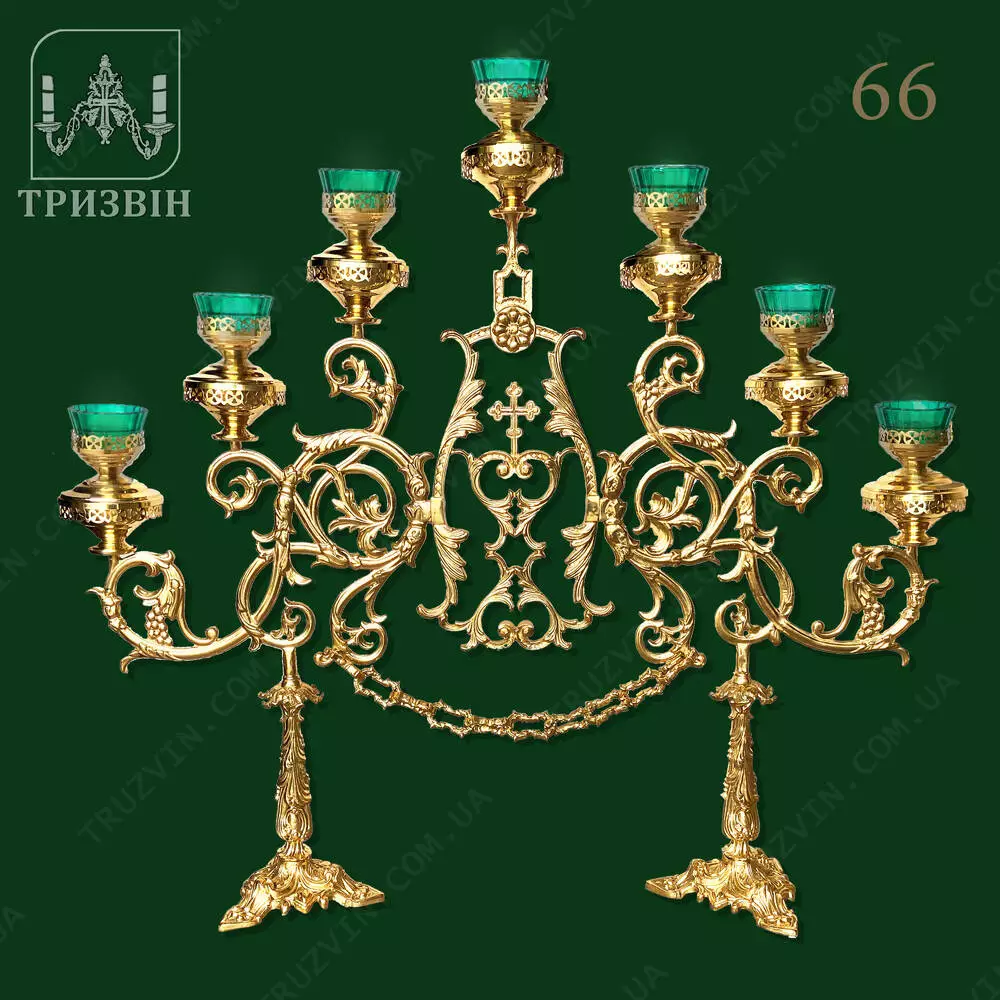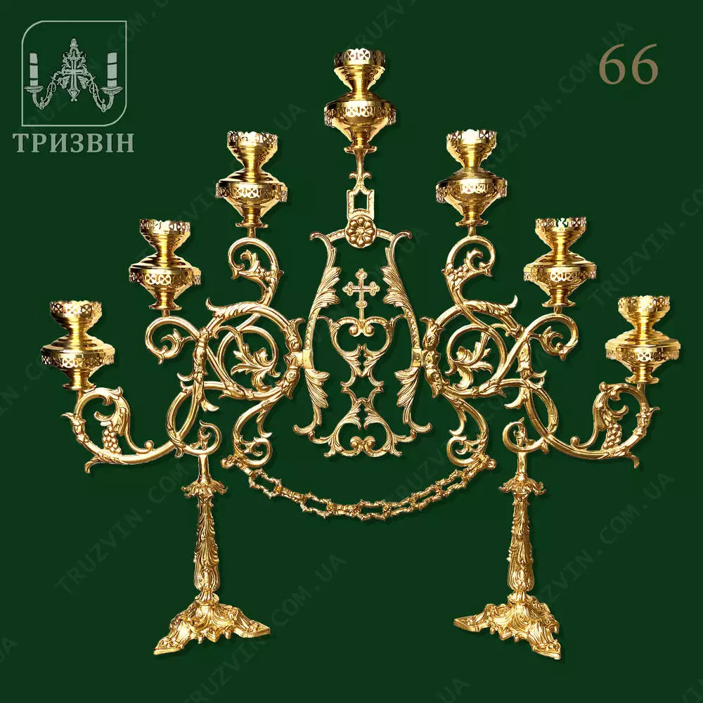 Запрестольний церковний семисвічник на квадратній трубі виготовлений з високоякісної латуні і покритий золотистою фарбою.