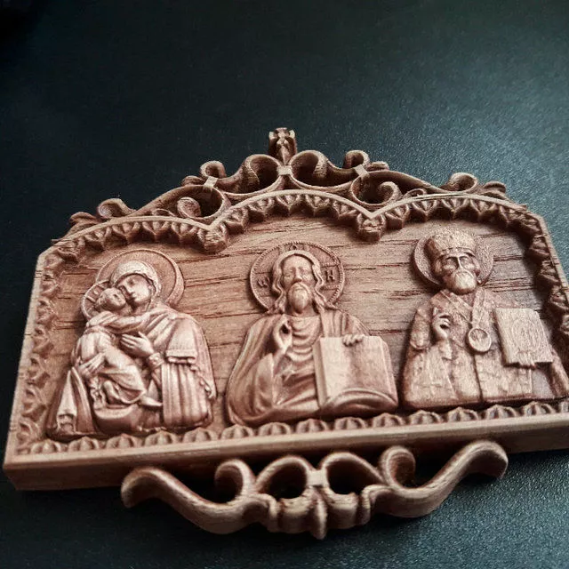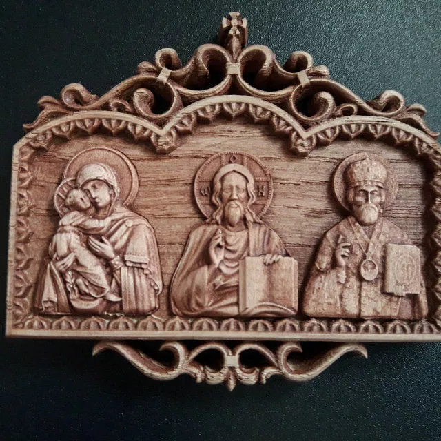 Предлагаем автомобильные иконы, выполненные из дерева. Иконы покрыты маслом и воском. Изделия изысканные, стильные. Резьба ажурная, хорошо выделяются мелкие детали. На иконе изображены образы Спасителя, Богородицы с младенцем, Николая Чудотворца.