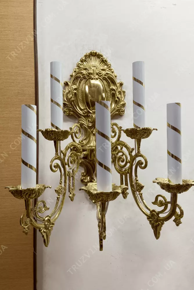 Большое церковное бра на пять свеч изготовлено высококвалифицированными мастерами на современном оборудовании. В качестве основного материала для изготовления была использована латунь. Этот материал идеально подходит для изготовления подобных изделий, потому что при правильном уходе он надолго сохранит свой первозданный внешний вид.