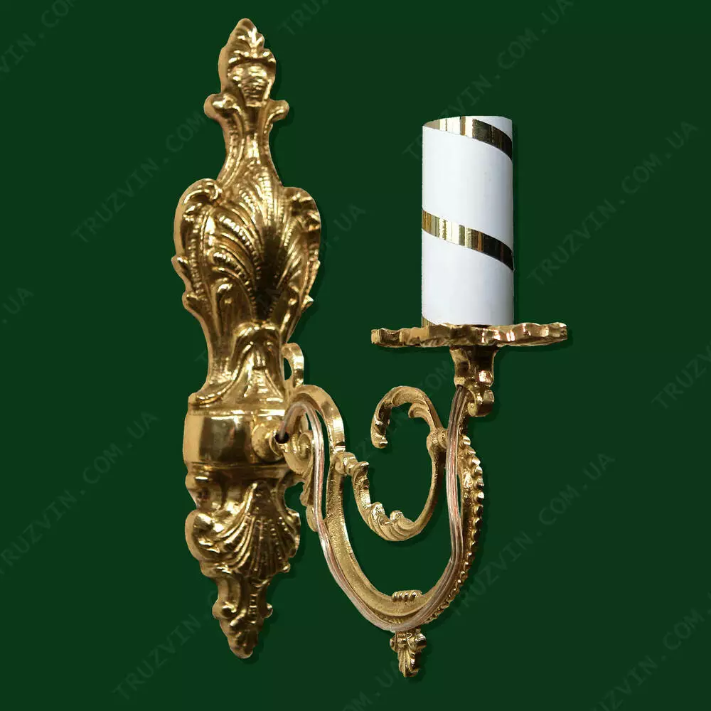Небольшое церковное бра на одну свечу из латуни. Покрытое золотистой краской, которая защищает его от различных негативных воздействий внешней среды. Также благодаря этому материалу изготовления бра не требует какого-либо специального ухода и надолго сохраняет свой первозданный внешний вид.