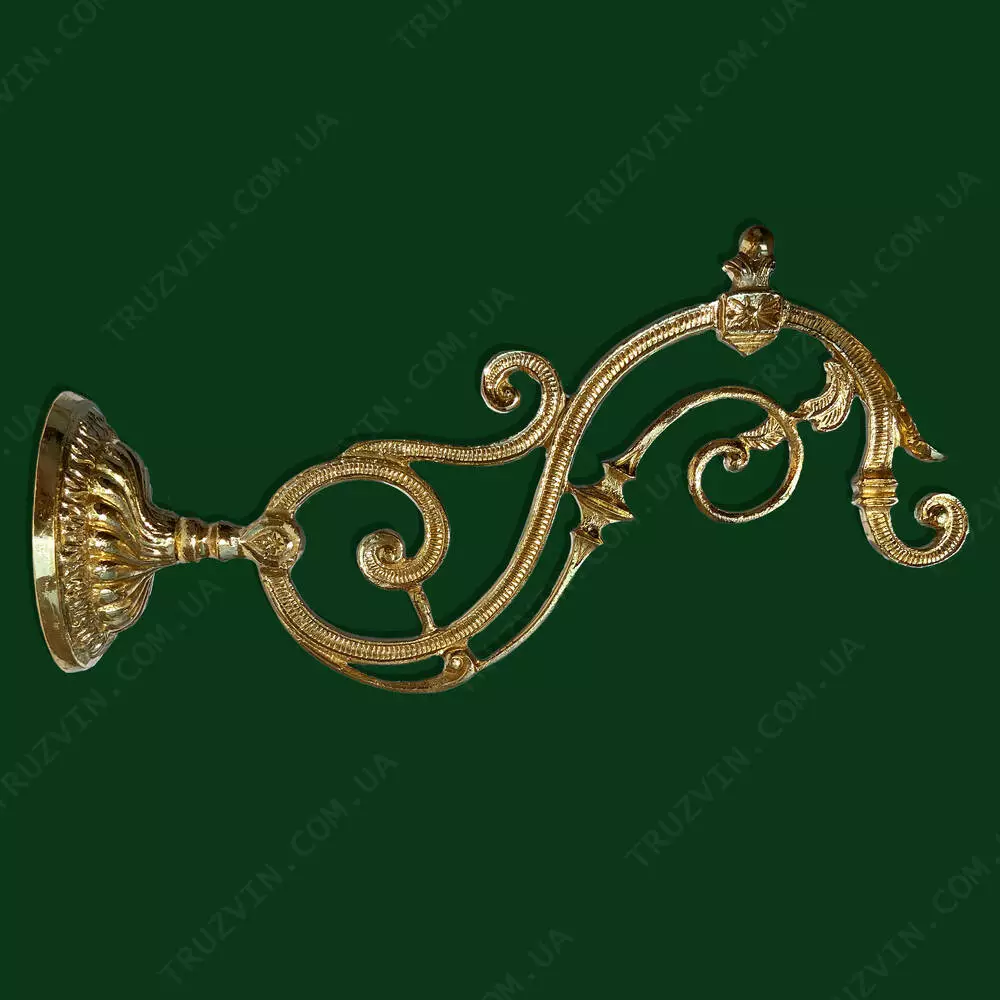 Большой кронштейн изготовлен из высококачественного сплава латуни, которая характеризуется прекрасной стойкостью к любым негативным факторам внешней среды. Для еще лучшей красоты данный кронштейн покрыт золотистой краской и разнообразными декорирующими элементами.