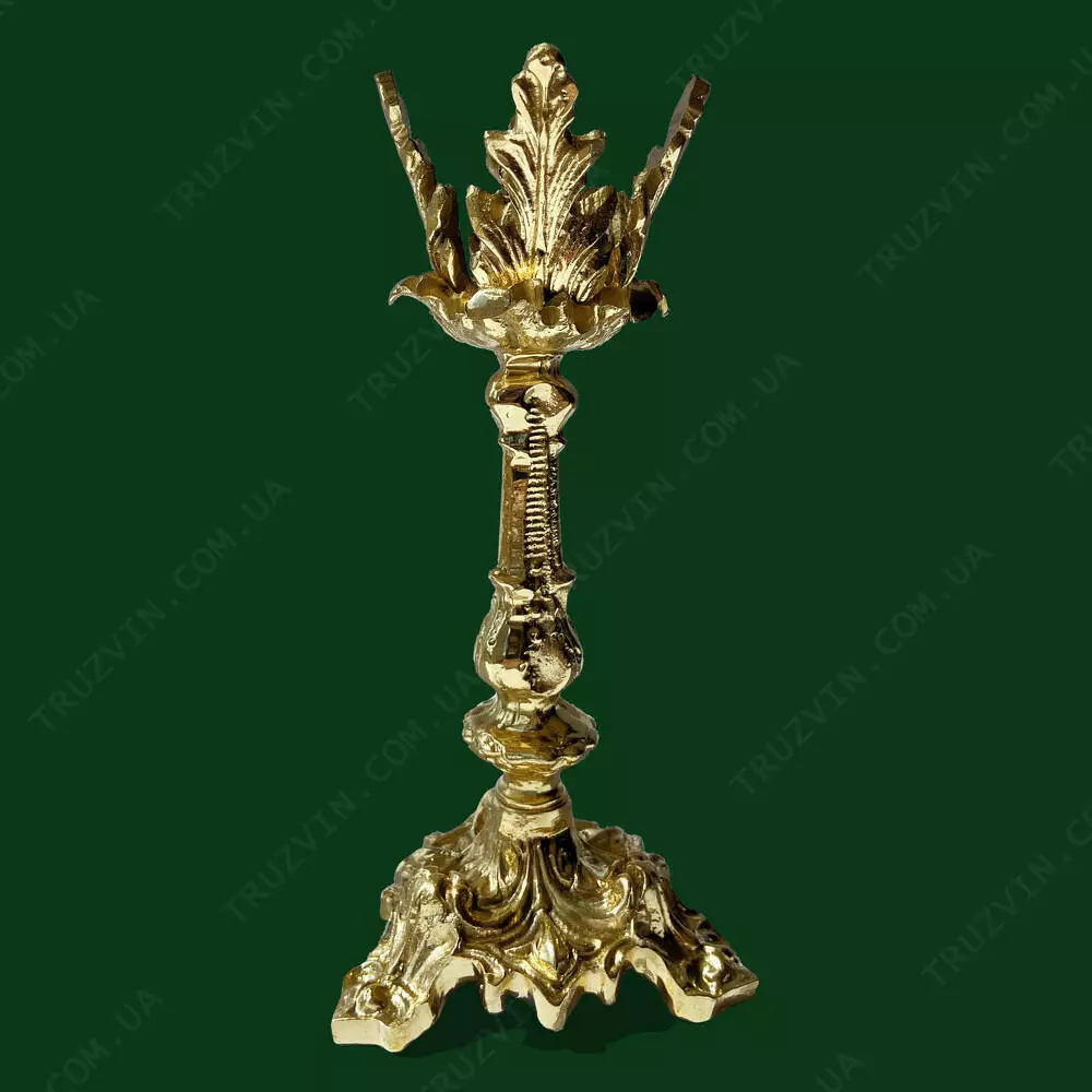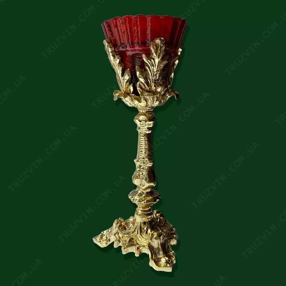 Церковная настольная лампадка золотистого цвета, украшена разнообразными декорирующими элементами. В качестве основного сырья для ее изготовления была использована латунь. Этот материал идеально подходит для подобных изделий, потому что надолго сохраняет свой первозданный вид при любых условиях.