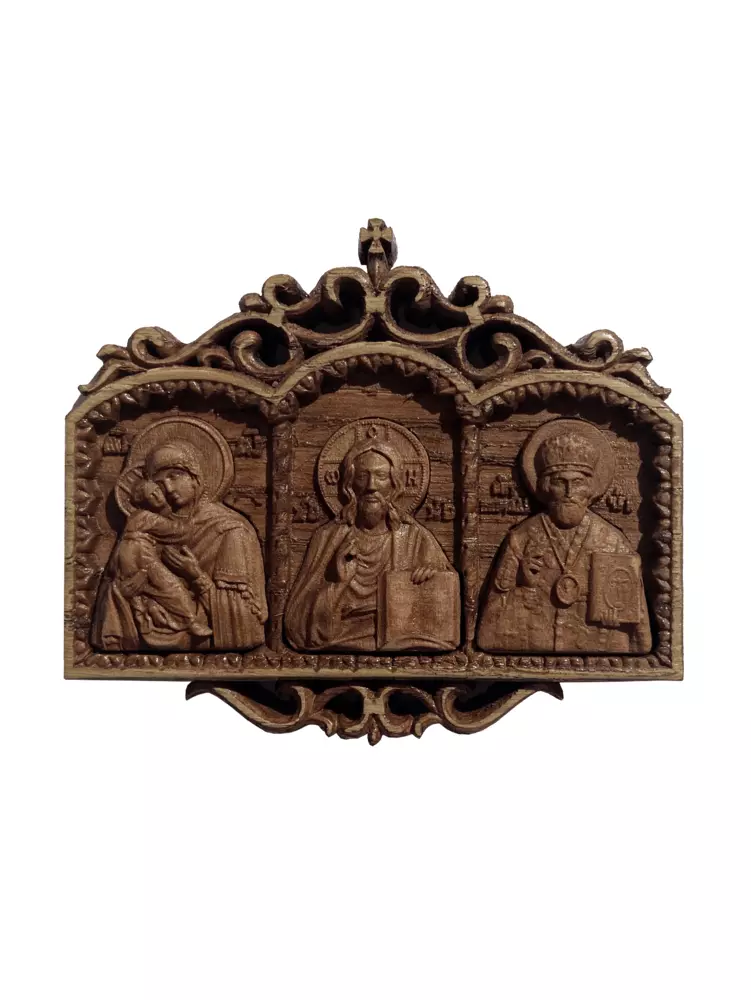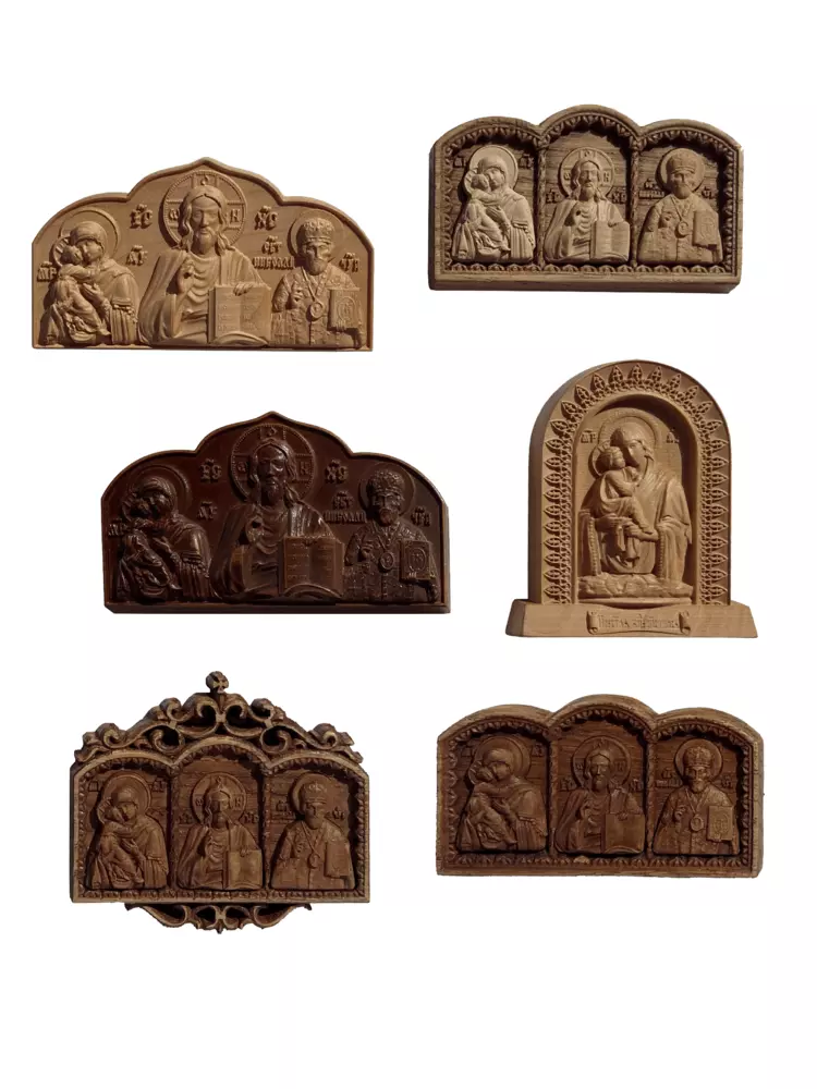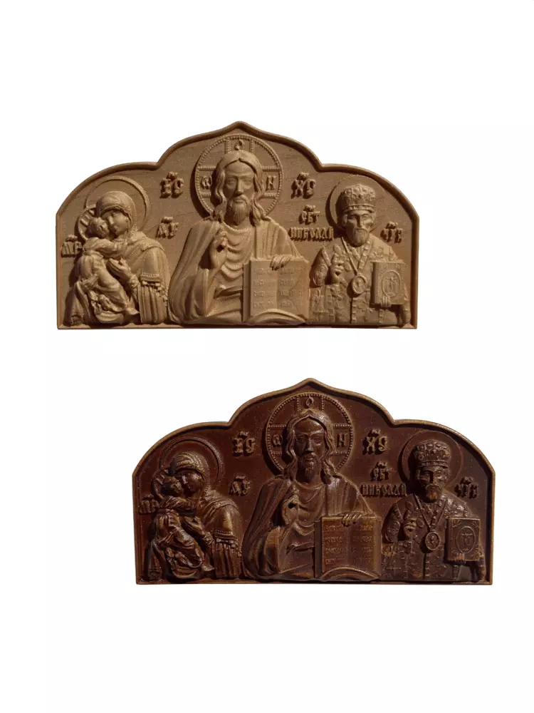 Иконы покрыты маслом и воском. Изделия изысканные, стильные. Резьба ажурная, хорошо выделяются мелкие детали. На иконе изображены образы Спасителя, Богородицы с младенцем, Николая Чудотворца.