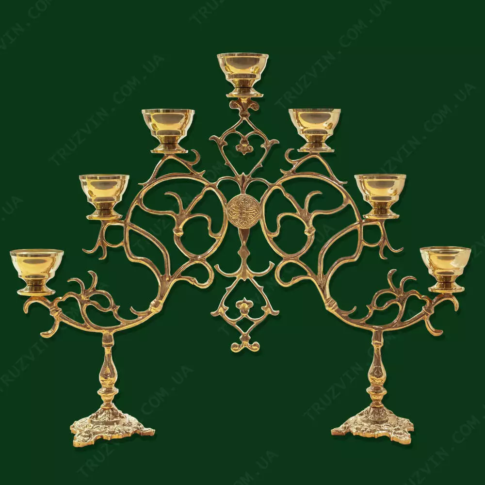 Напрестольный церковный семисвечник изготовлен из высококачественной латуни. Для большей красоты покрыт золотистой краской.
