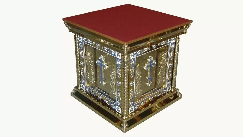 Церковный жертвенник нового поколения, который изготовлен из высококачественной латуни и украшен золотистой краской и разнообразным камнями.